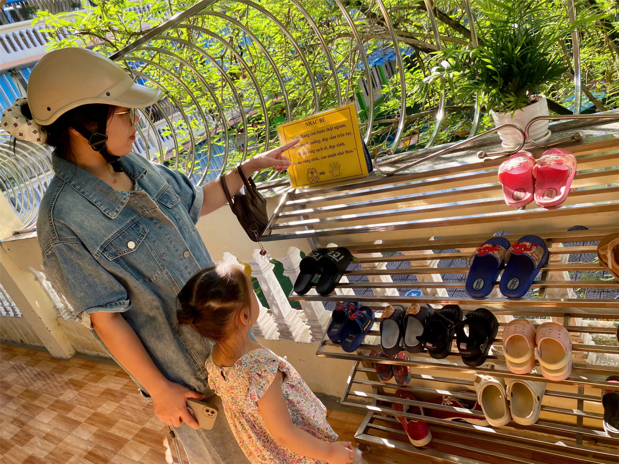 tay nhau, vui vẻ cất dép gọn gàng ở giá trước khi vào hành lang, cầu thang thật