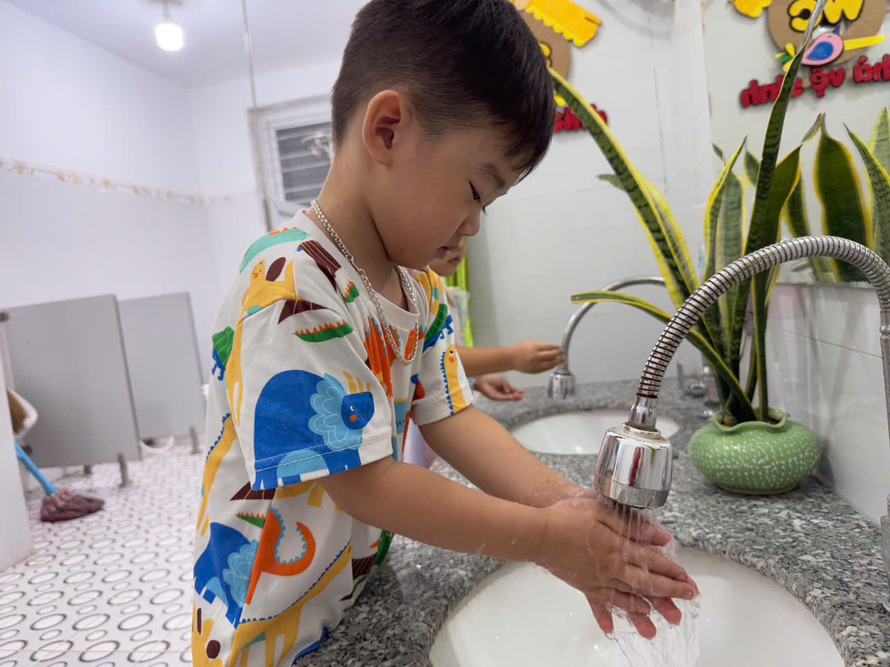 * Thực hiện viêc cho trẻ rửa tay thường xuyên bằng xà phòng, đặc biệt là trước khi ăn, sau khi đi vệ sinh, sau khi chơi ngoài trời.