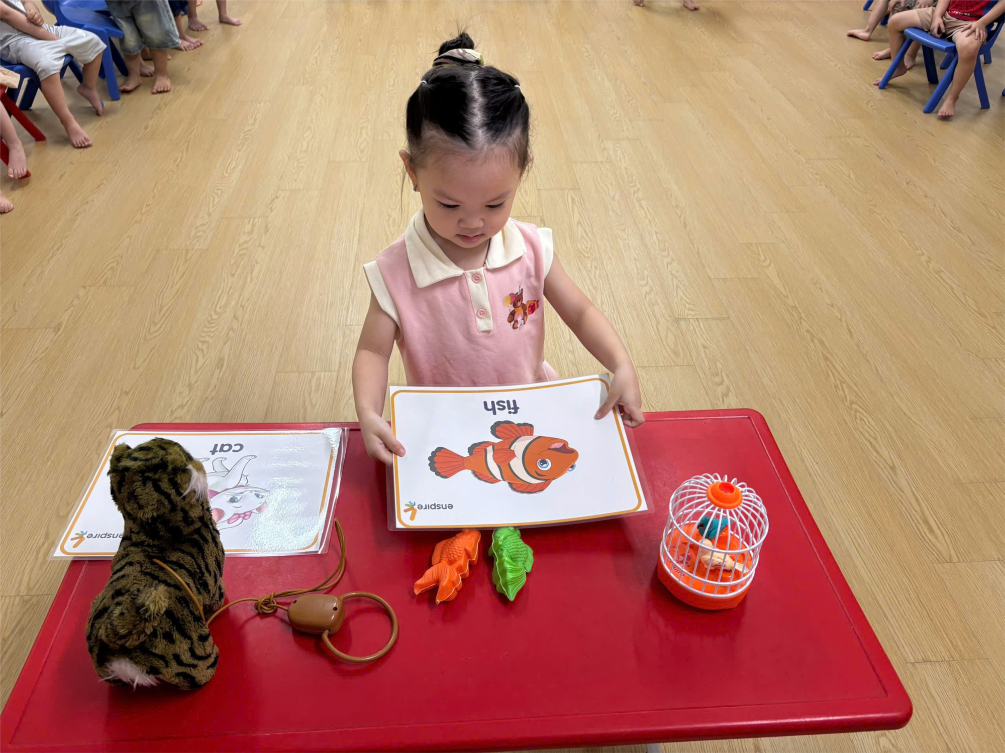 Trong tuần này các con lớp 3TA1- Montessori đã học 3 từ mới: bird (con chim), fish (con cá), cat (con mèo) và tập nói câu: