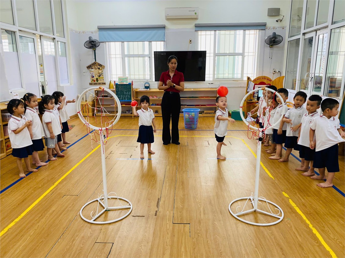 ⚽ Trẻ biết tên vận động, xác định được hướng ném, biết ném trúng đích thẳng đứng bằng một tay.