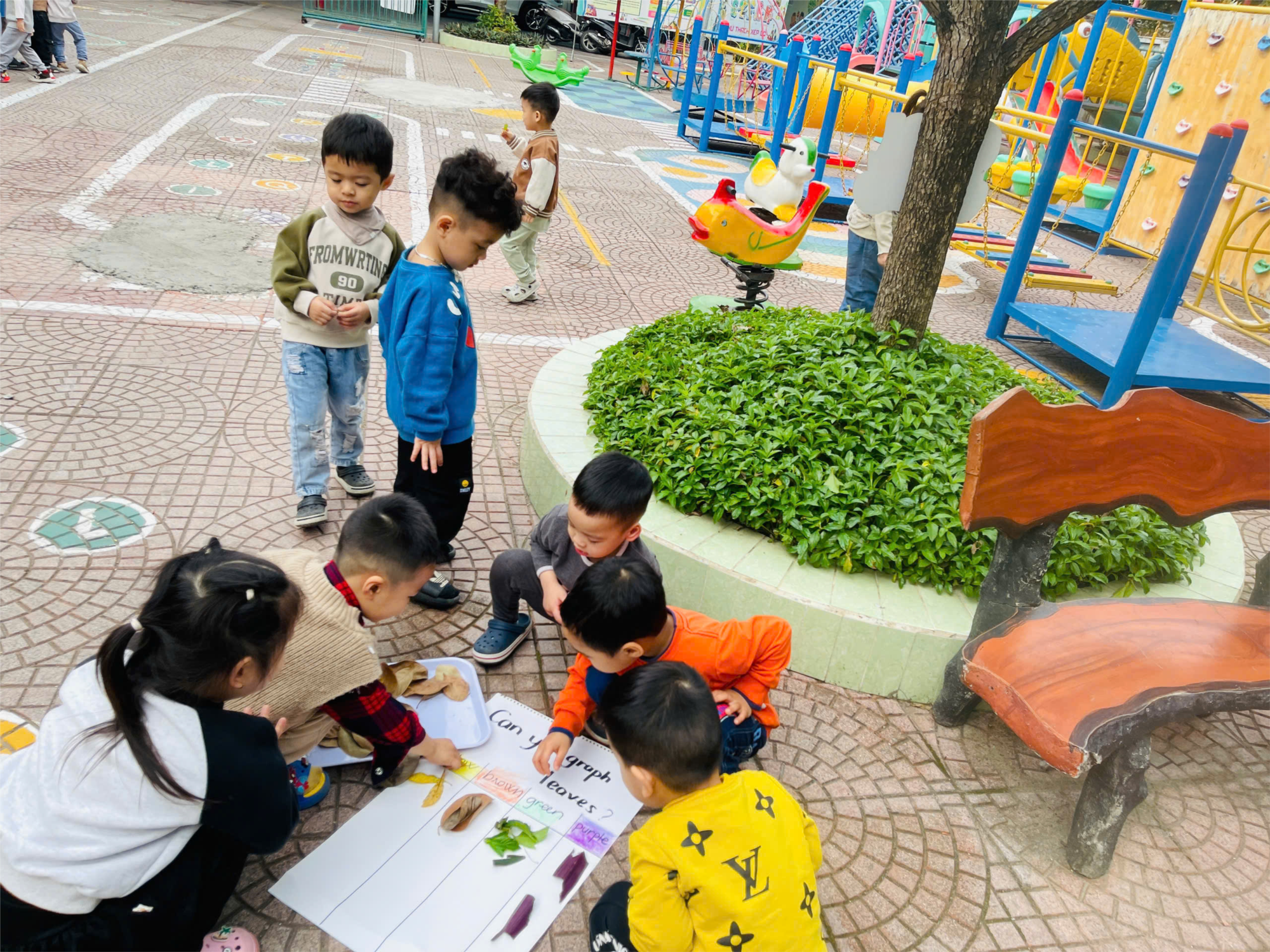 Các con cùng nhau quan sát lá cây trong sân trường, phân loại theo màu sắc và tạo bảng “graph leaves” sinh động.