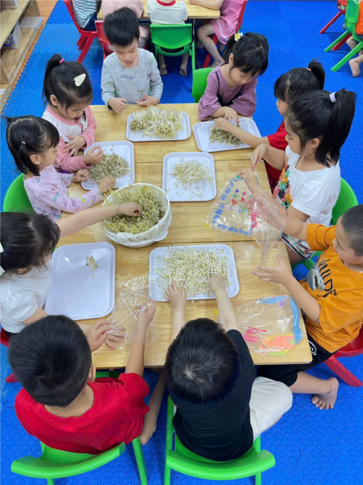 Từ việc chọn hạt đỗ, ngâm rửa, cho đến việc lót khăn và tưới nước, các con đều thực hiện một cách tỉ mỉ và hào hứng. Cô giáo cũng đã kể cho các con nghe về những lợi ích của giá đỗ đối với sức khỏe! Mỗi bạn đều háo hức quan sát từng hạt đỗ nảy mầm và lớn lên từng ngày. Qua hoạt động này, các con không chỉ hiểu thêm về quá trình sinh trưởng của cây mà còn rèn luyện tính kiên nhẫn và yêu thích thiên nhiên. 🌱