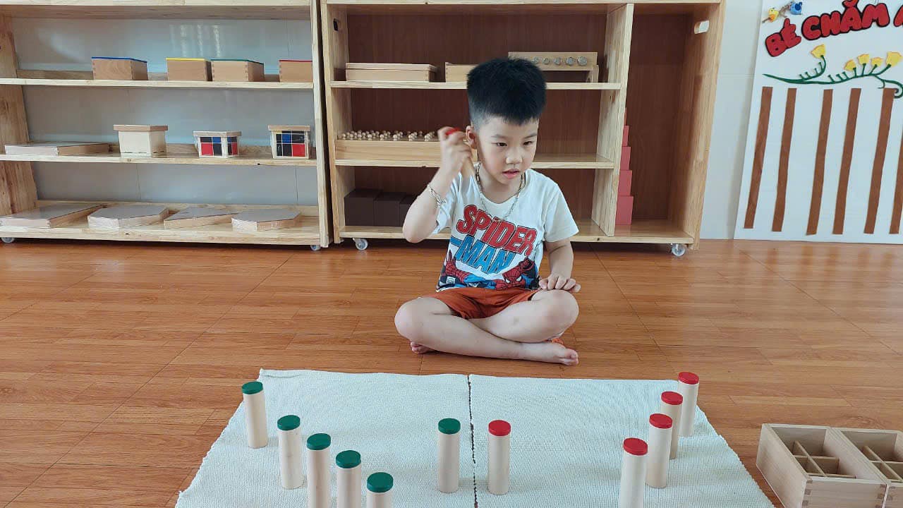 này được đựng trong lọ có nắp đậy kín. Khi lắc từng lọ, trẻ lắng nghe và đoán âm thanh, trí tưởng tượng của các con sẽ bay xa, mở ra những câu chuyện thú vị và hình ảnh sống động trong tâm trí. Khi lắc lọ xanh và đỏ để tìm ra cặp âm thanh giống nhau, trẻ sẽ phát triển thính giác, khả năng ghi nhớ và nâng cao sự tập trung. Hoạt động này không chỉ giúp trẻ thêm yêu thích âm nhạc mà còn là nền tảng vững chắc cho sự phát triển toàn diện trong tương lai.
