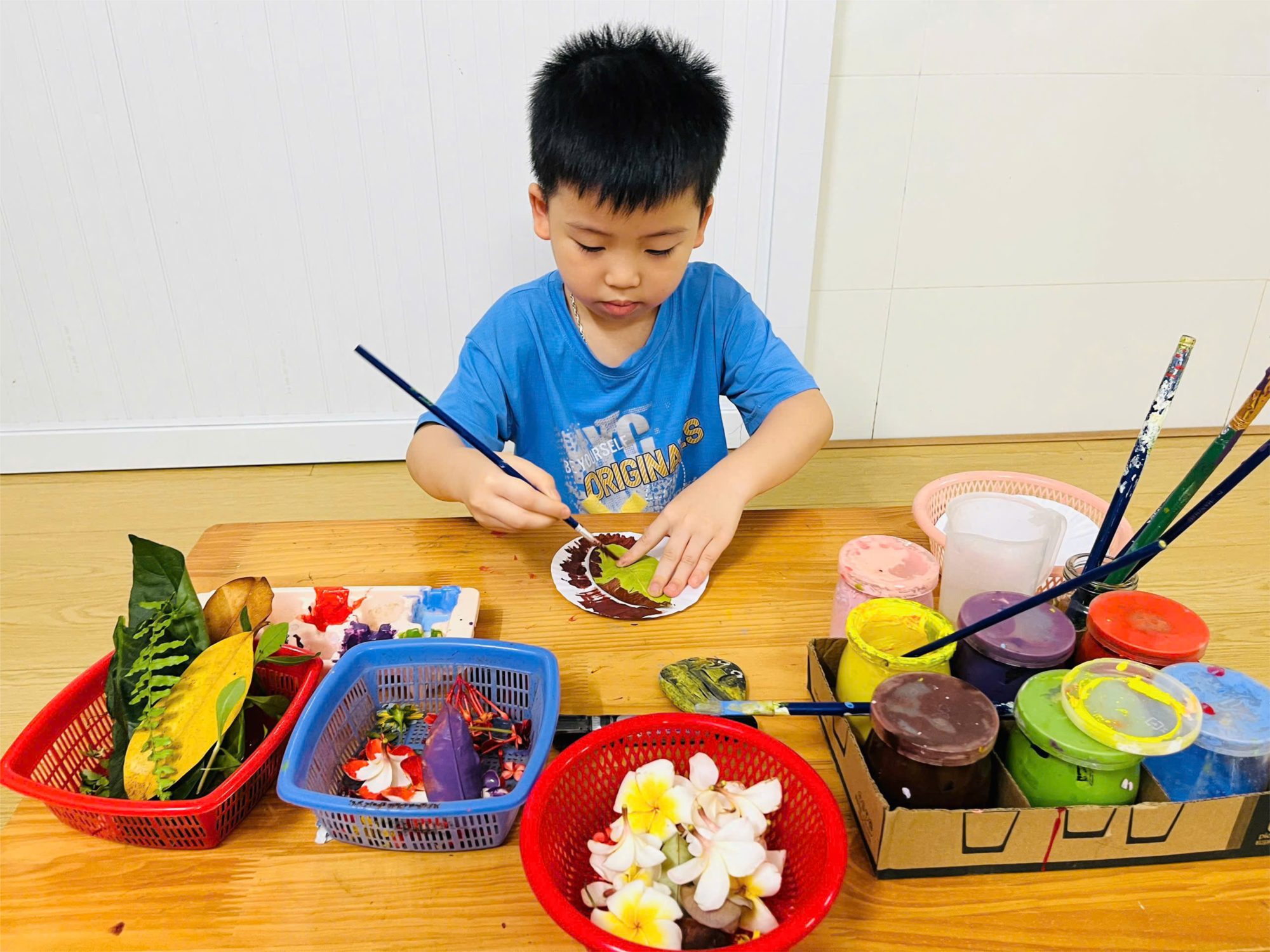 nay, các bạn nhỏ lớp 4 tuổi A1 đã có một buổi sáng đầy hào hứng và bổ ích khi cùng nhau khám phá sân trường, nhặt những chiếc lá, cánh hoa nhỏ xinh và mang về lớp để tham gia một hoạt động nghệ thuật vô cùng thú vị: in hình hoa, lá lên đĩa giấy!