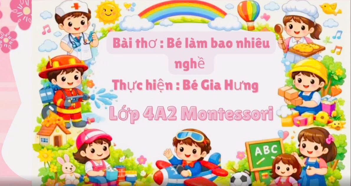 👉Hôm nay, các cô rất vui khi được gia đình bé Gia Hưng – lớp 4A2 gửi bài học con ôn luyện ở nhà với bài thơ “Bé làm bao nhiêu nghề”.