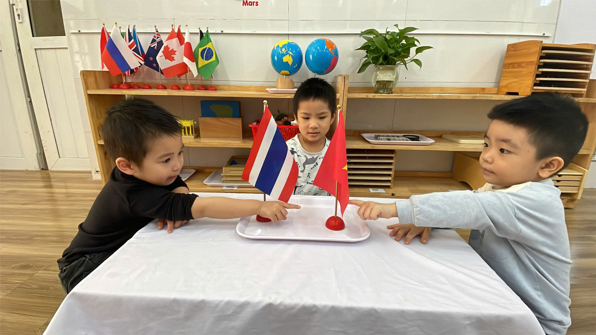 Các bạn nhỏ lớp 3A1 đã cùng cô nhận biết cờ quốc gia Việt Nam và Thái Lan thông qua bộ giáo cụ lá cờ Montessori đầy màu sắc. 🌟