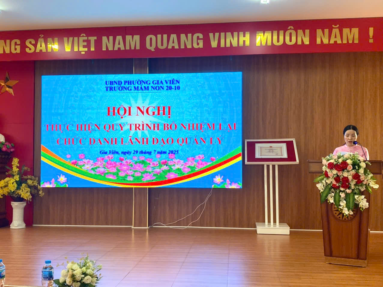 Được sự đồng ý của Thưởng trực Đảng, UBND phường Gia Viên, ngày 29 tháng 7 năm 2025 Trường Mầm non 20-10 tổ chức Hội nghị thực hiện quy trình bổ nhiệm lại chức danh lãnh đạo quản lý
