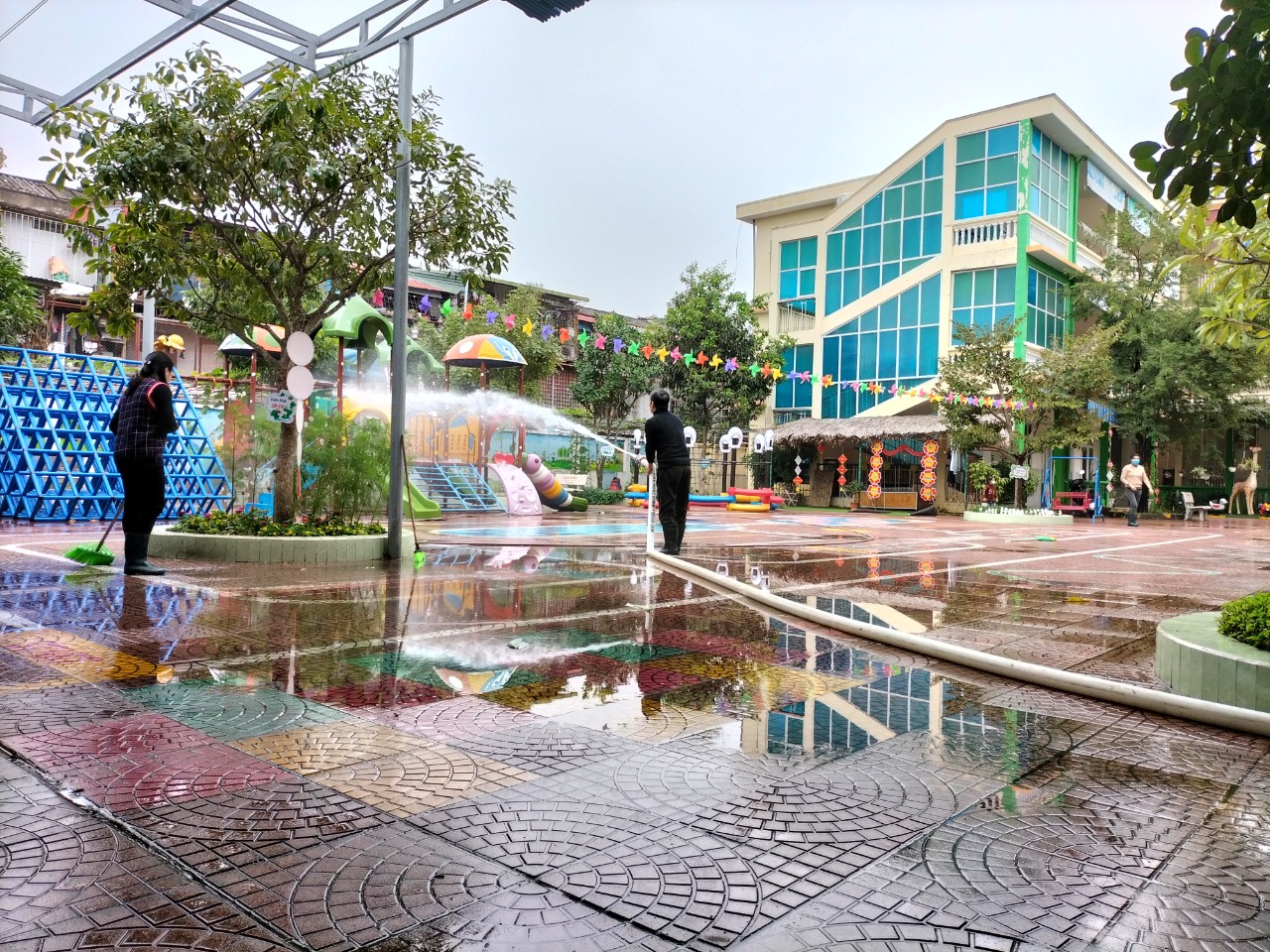 Ban giám hiệu nhà trường phân công giáo viên, nhân viên tổng vệ sinh các lớp học, bếp ăn, sân trường để đảm bảo môi trường luôn an toàn – xanh - sạch - đẹp.
